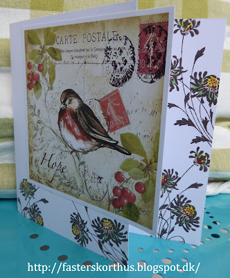 På det første kort har jeg stemplet blomster på diverse designpapirer, klippet dem ud og sat dem på kortet