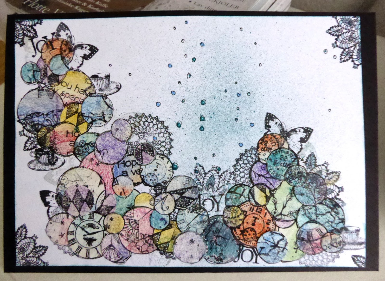 fandt ud af hvordan de skulle placeres - stemplede med lidt doili på må og få - sprayed lidt blå mist fra Ranger på -